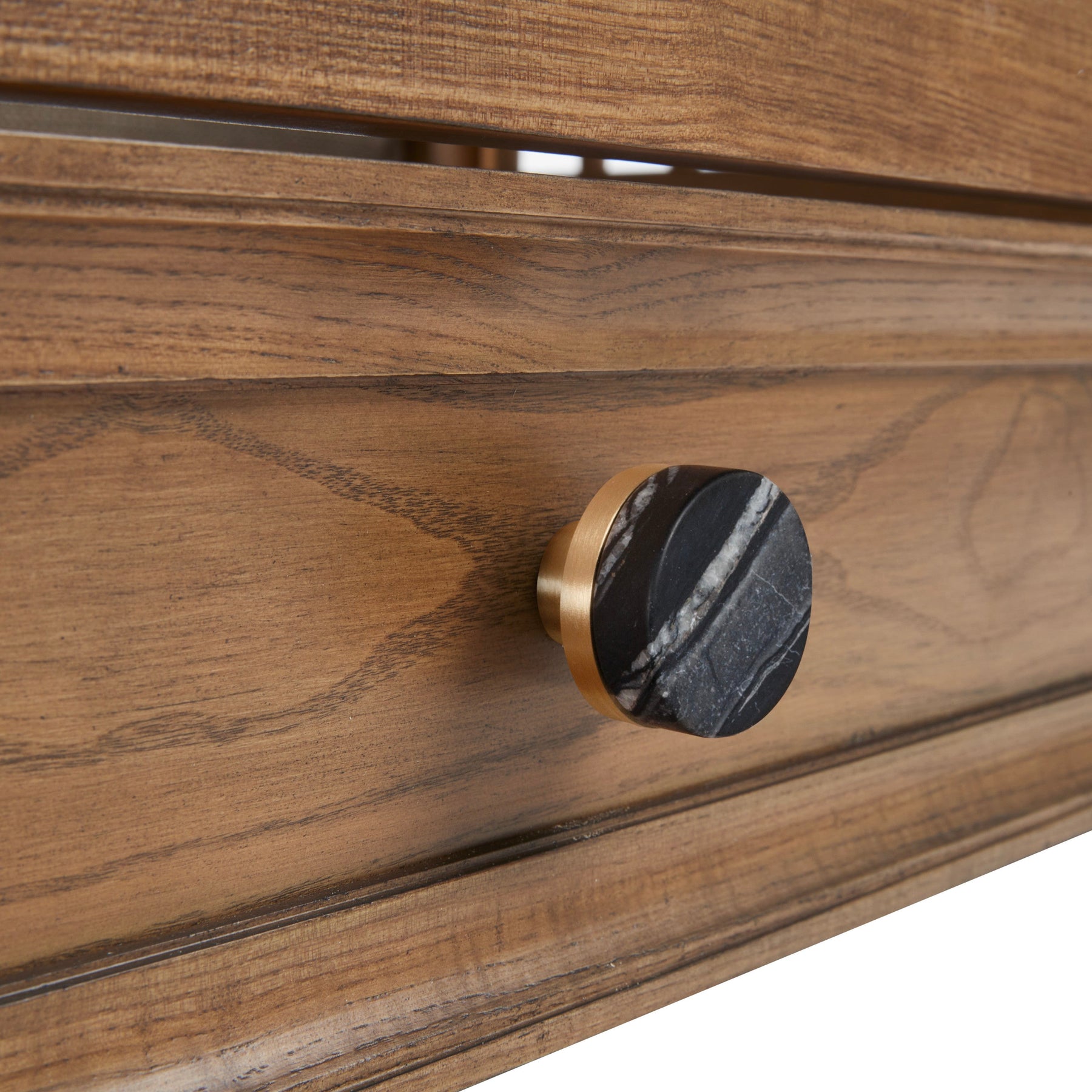 - Built-in under-crib storage drawer accented with marble and brass drawer knob.
