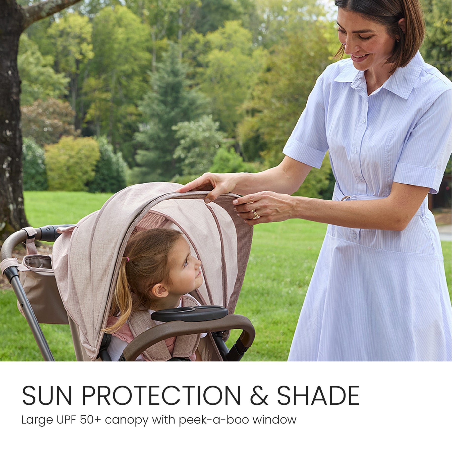 • SUN PROTECTION & SHADE: Help protect your tiny passenger from the sun with the large UPF 50+ canopy and visor. Easily check in through the peek-a-boo window during strolls.