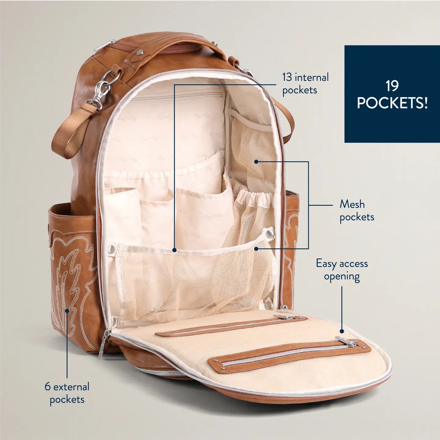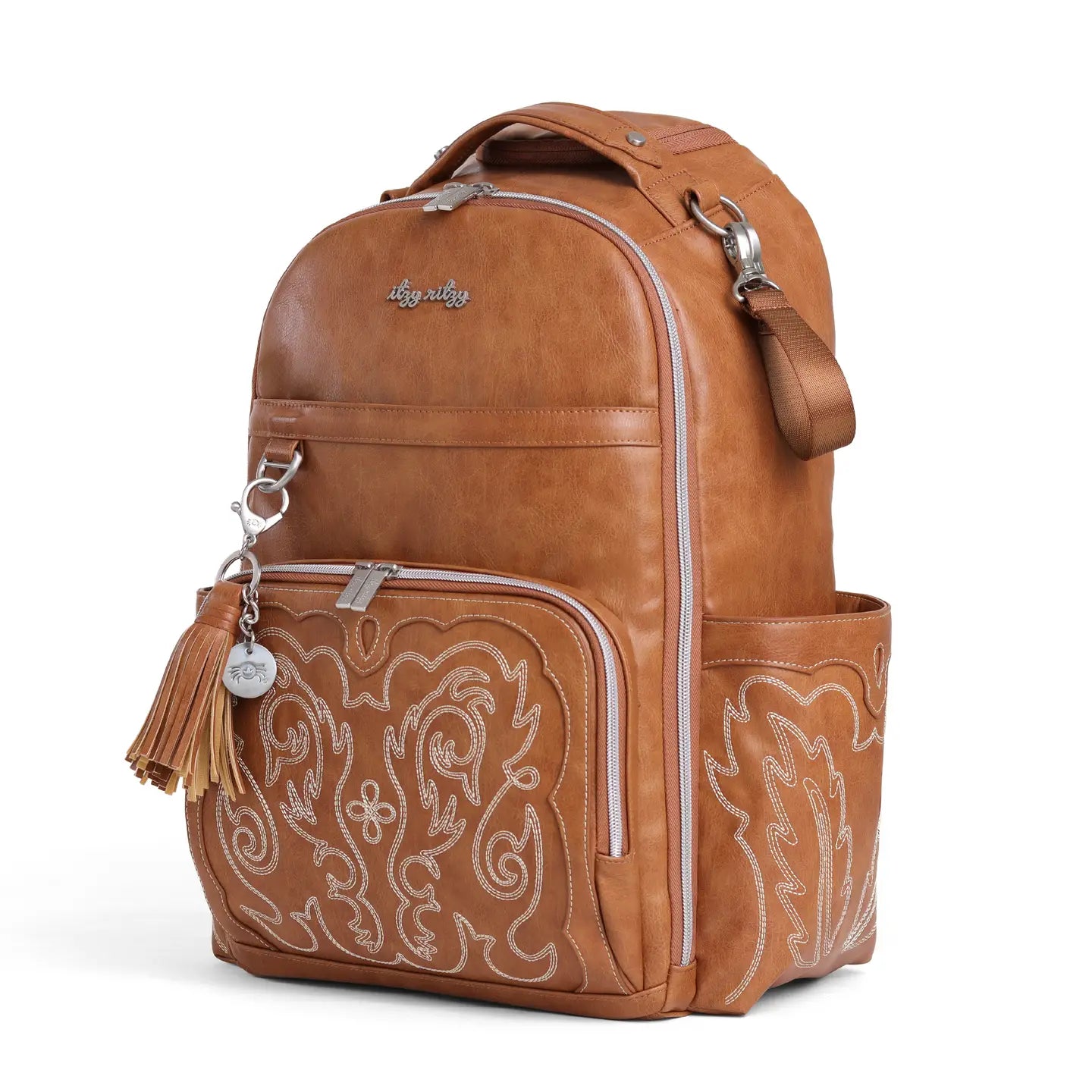 Your forever bag for baby & beyond, every (little) step along the way! The Boss Plus™ Backpack is everything you love in our original Boss Backpack with a sleek design and premium features. Elevated with thoughtful organization and style, this bag is perf to take on your new babe’s journey – from all packed up to welcome baby at the hospital to adventurous playdates to an amazing work, pumping or me-time bag for you. Plus, this is the ultimate baby diaper bag for those with a passion for travel as an airplane carry-on or a car seat tag-along. Features: - Tassel with Charm - Removable vegan leather accent tassel with engraved chain link charm - Tons of interior and exterior pockets, 19 total pockets (13 internal and 6 external including 2 large, insulated bottle pockets) and a unique, easy access front mom pocket with 3 interior pockets and key lanyard. Laptop pocket – fits up to a 15” laptop. Zippered tall front external pocket - Coordinating easy wipe changing pad included with whimsical "head" and "toes" printed on the inside. - New Itzy Ritzy Logo and Braid Rubber Foot design - Stroller Straps - Includes coordinating stroller straps to free your hands when you are on-the-go