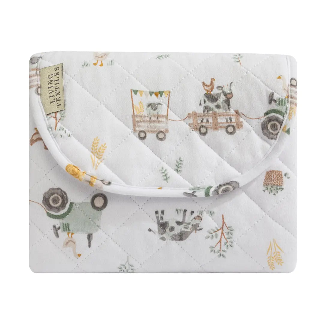 Hop aboard for an adventure that captures the charm of country life! Our Tractor Ride baby collection is a delightful tribute to the simple joys of the farm, where playful tractors haul adorable farm animals and bales of hay, inviting your little one to explore a world of warmth and wonder. Perfect for on the go, this waterproof travelling change mat features a premium cotton outer layer with an inner layer of nylon for easy cleaning. Providing a large surface for when you are changing baby on the go, this travelling change mat folds up small to fit even the fullest of nappy bags!
