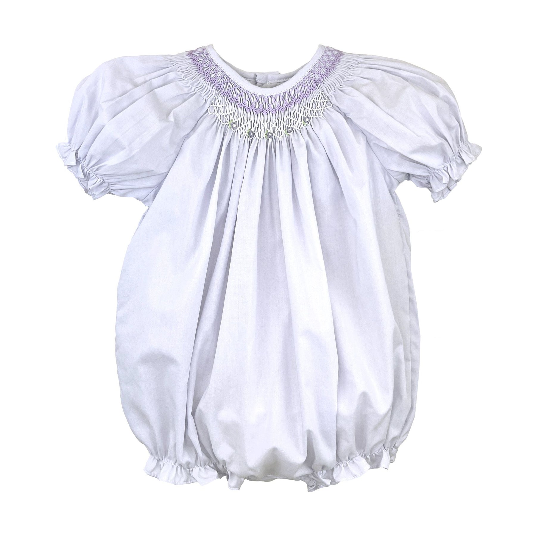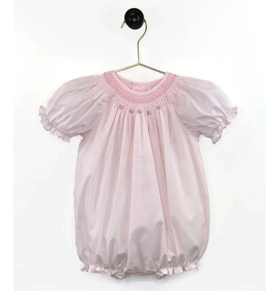 Featuring heirloom-quality handcrafted details like bishop smocking and embroidered rosette flowers, this piece is sure to become a treasured keepsake.