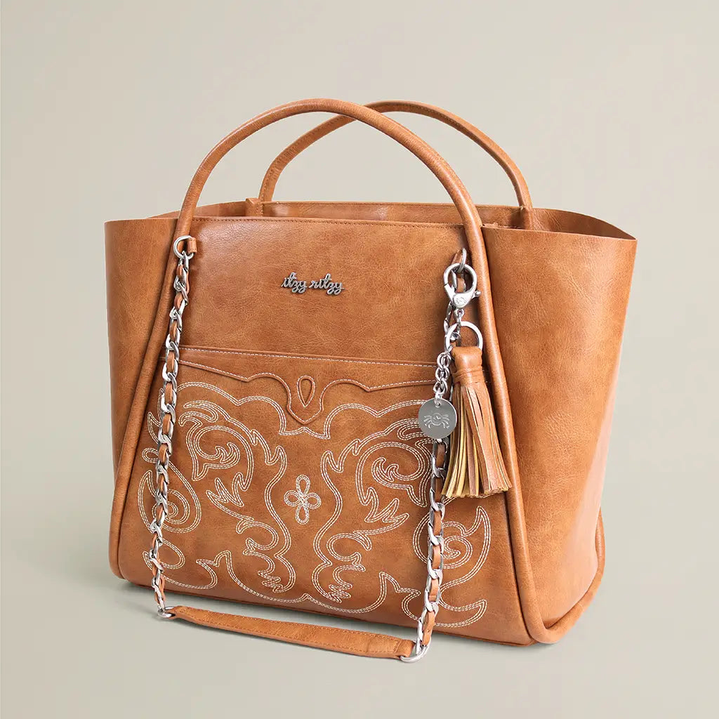 Meet the tote you`ll never outgrow - from diaper bag for baby to chic purse for brunch! The Boss Tote is designed to move with you featuring an easy-wipe vegan leather exterior and the option to carry by handles or luxe, chain-detailed shoulder straps. Organization is a total breeze with a spacious main compartment offering multiple interior pockets for your valuables, changing essentials & so much more! Plus, a front pocket for easy access & hook closure to keep everything inside secure. Bonus: includes a coordinating changing pad, stroller straps, and removable tassel! Safe to say, you`re going to tote-ally love it!